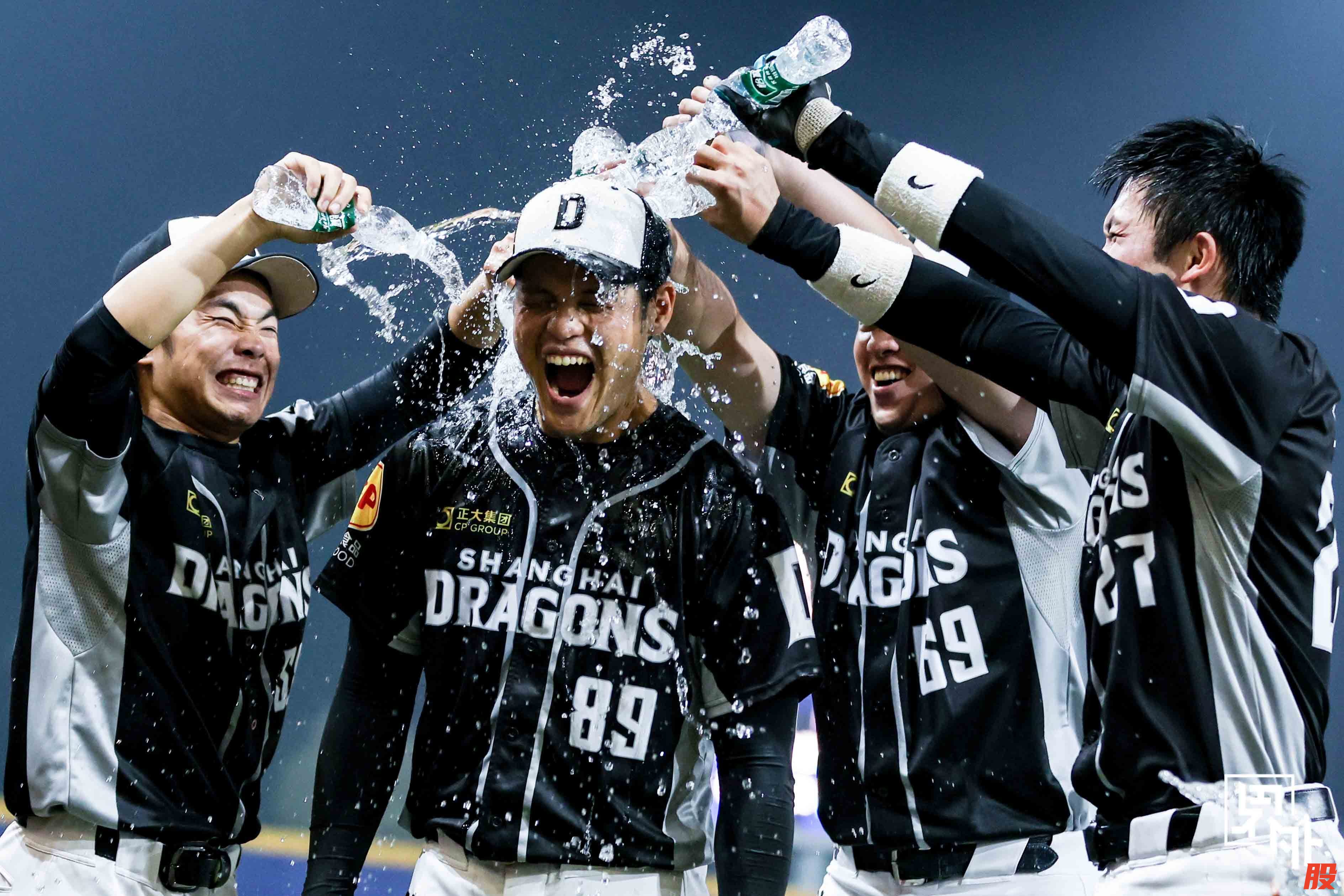 上海正大龙队球员为当场MVP球员巴奇达鲁浇水庆祝